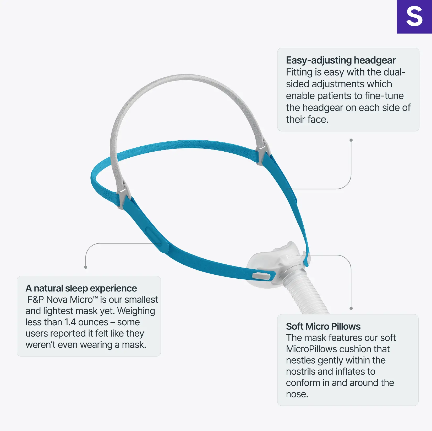 • 1 x F&P Nova Micro™ Nasal Pillow Mask